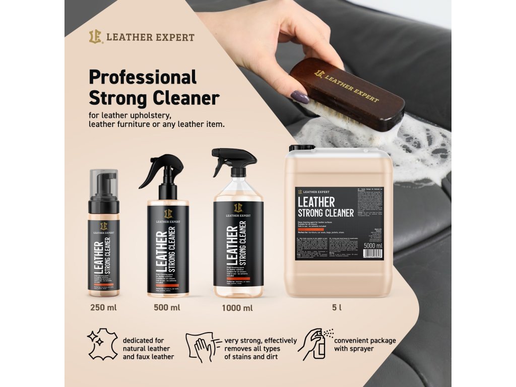 Strong Cleaner proniká do textury kůže a odstraňuje i odolný skvrny a mastnotu. Díky bohatý pěně drží na povrchu a čistí efektivnějc než běžný kapalný čističe.