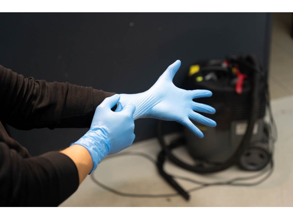 Nitrilové rukavice, které jsou chemicky odolné a určeny primárně pro ruční mytí auta a práci s chemií.