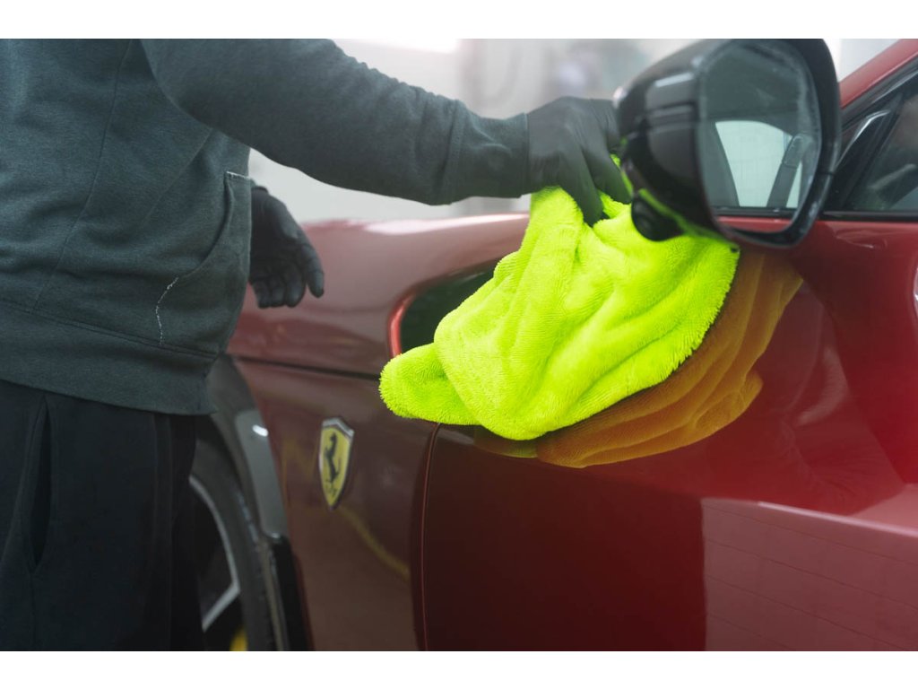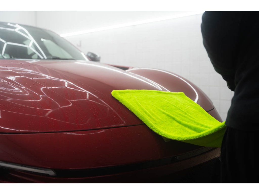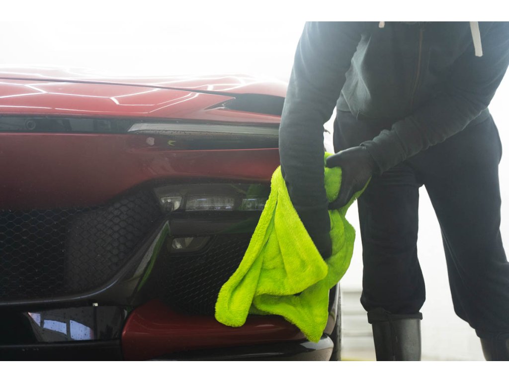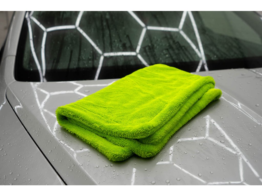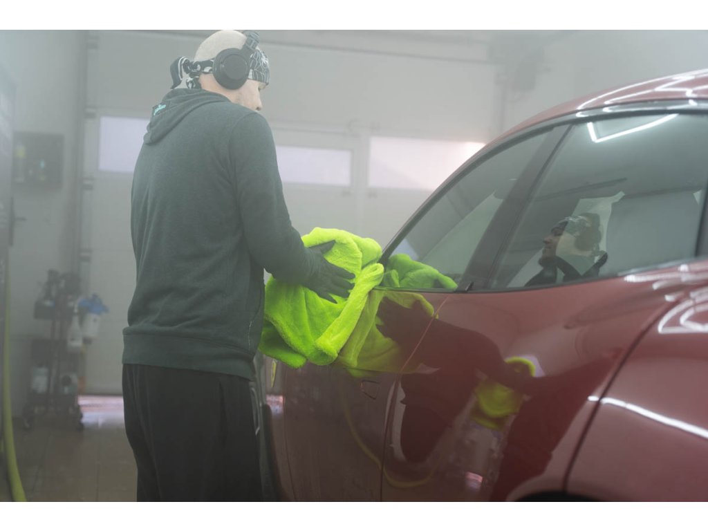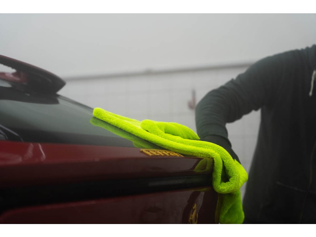 Ručník má vysokou hustotu vláken 1400 GSM, která saje stejně dobře jako motor BMW olej (jen vtip, proti BWM nic nemáme 😁). Jeden ručník zvládne celé auto průměrné velikosti Octavie – žádné ždímání uprostřed práce. Stačí přiložit, lehce přetáhnout a je sucho. Funguje perfektně na ošetřeném laku, kde jde voda krásně dolů, ale poradí si i s neošetřeným lakem.